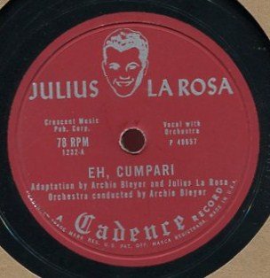 Here for your delectation is the SPECTACULAR & RARE------------------EH, CUMPARI / TILL THEY'VE ALL GONE HOME by JULIUS LA ROSA, ORCHESTRA CONDUCTED BY ARCHIE BLEYER /CADENCE 1232 /78 rpm RECORD.THIS ITEM IS NOT AVAILABLE ANYWHERE!!Julius La Rosa (born January 2, 1930) is a popular music singer who has worked in both radio and television since the 1950s.Archie Bleyer, Arthur Godfrey's bandleader, formed Cadence Records in 1952. The first performer signed was La Rosa, who would hit gold with his third recording, "Eh, Cumpari" in 1953. La Rosa got an award as the best new male vocalist of 1953.HIGHLY RECOMMENDED!!!***CAVEAT FOR PURCHASERS OF 78RPM RECORDS FROM BARRY'S BARGAIN BIN***(1) These records are very old--always fifty to ONE HUNDRED years or more; (2) As such, the recording quality is never more than acceptable--especially in comparison to Hi-Fi, Stereo, and Digital recordings. These are always noisy, with clicks, pops, etc.; (3) If I notice a substantial scratch under normal light, I will mention it in the ad; but I have not played these records and have no idea whether they will be suitable to your requirements. They are offered as COLLECTIBLE items. (4) Hence, NO RETURNS WILL BE ACCEPTED--FOR ANY REASON!This leads to an explanation of shipping. I have, in the distant past mailed 78rpm records worldwide, with less than satisfactory results. Since these records were made of shellac, a considerable amount of breakage ensued. I have been informed that major shipping companies--UPS, FEDEX, et al.--are prepared to handle these items and guarantee success in delivering them. The approximate cost to ship one record in the US is (with minor variations concernings zip codes). That will cover all shipping and handling costs--including insurance and tracking. International shipping will require a specific and higher quote. I (and my customers) seek guaranteed hassle-free delivery and assurances from trusted shipping companies.